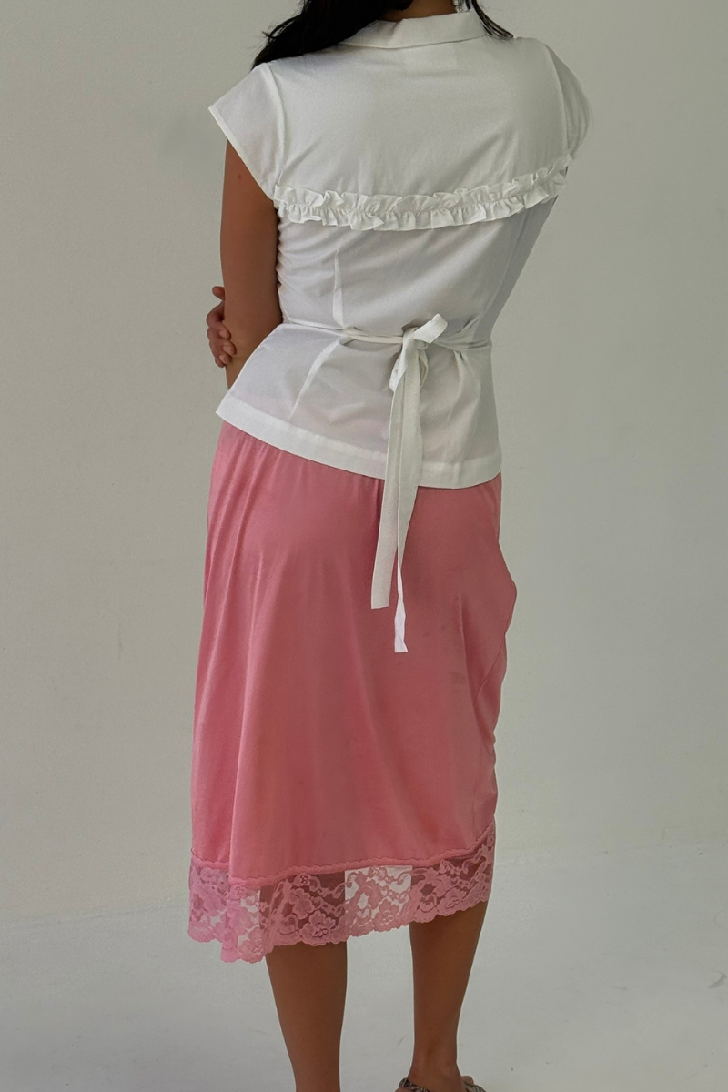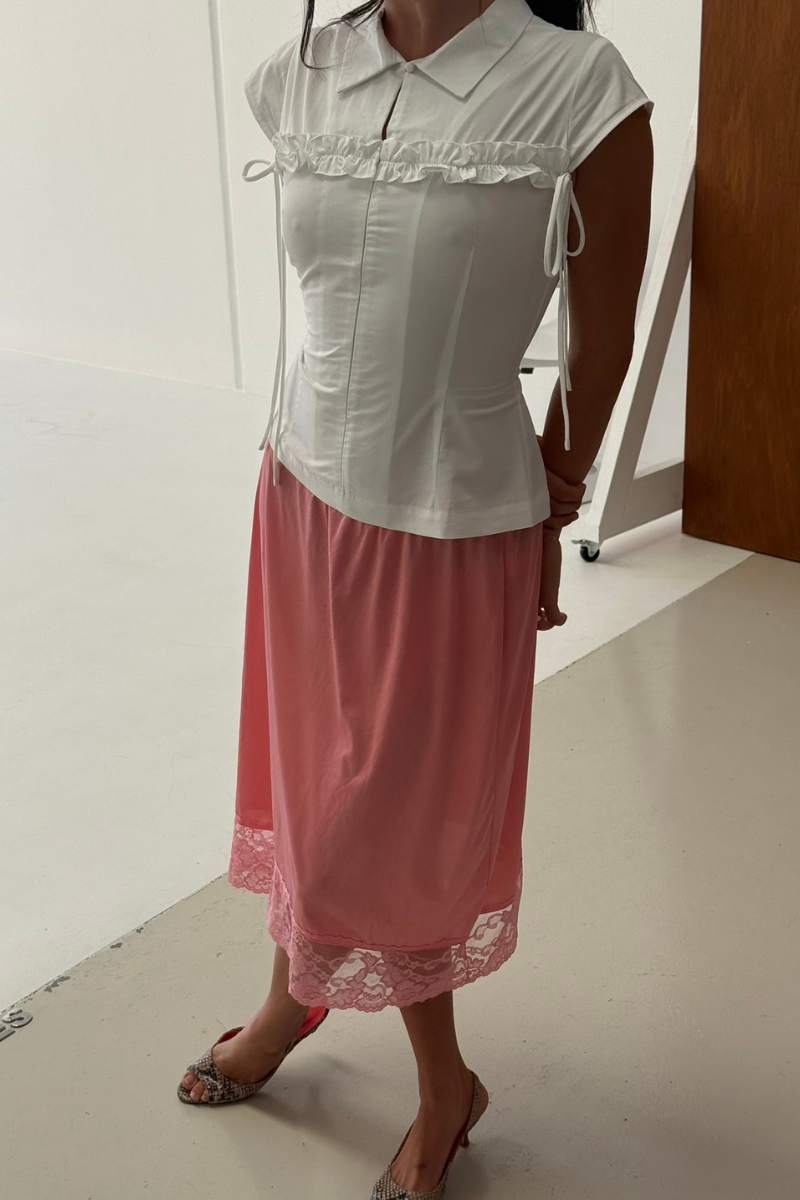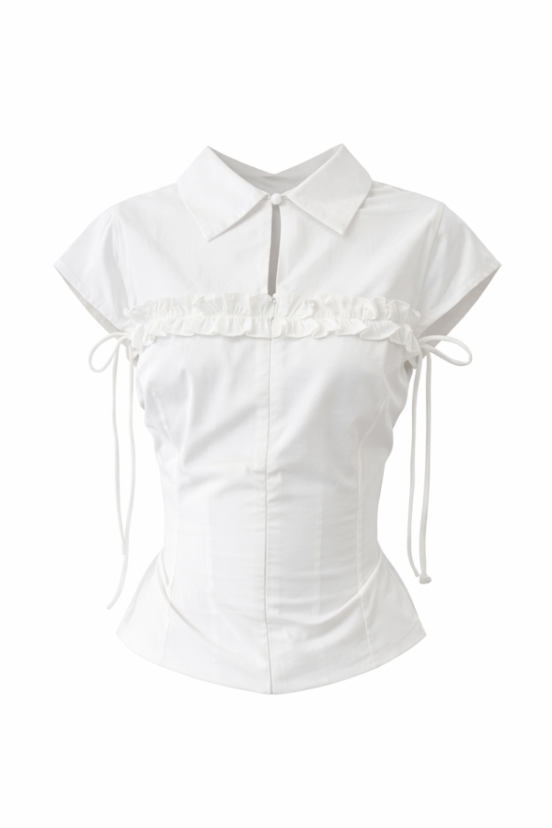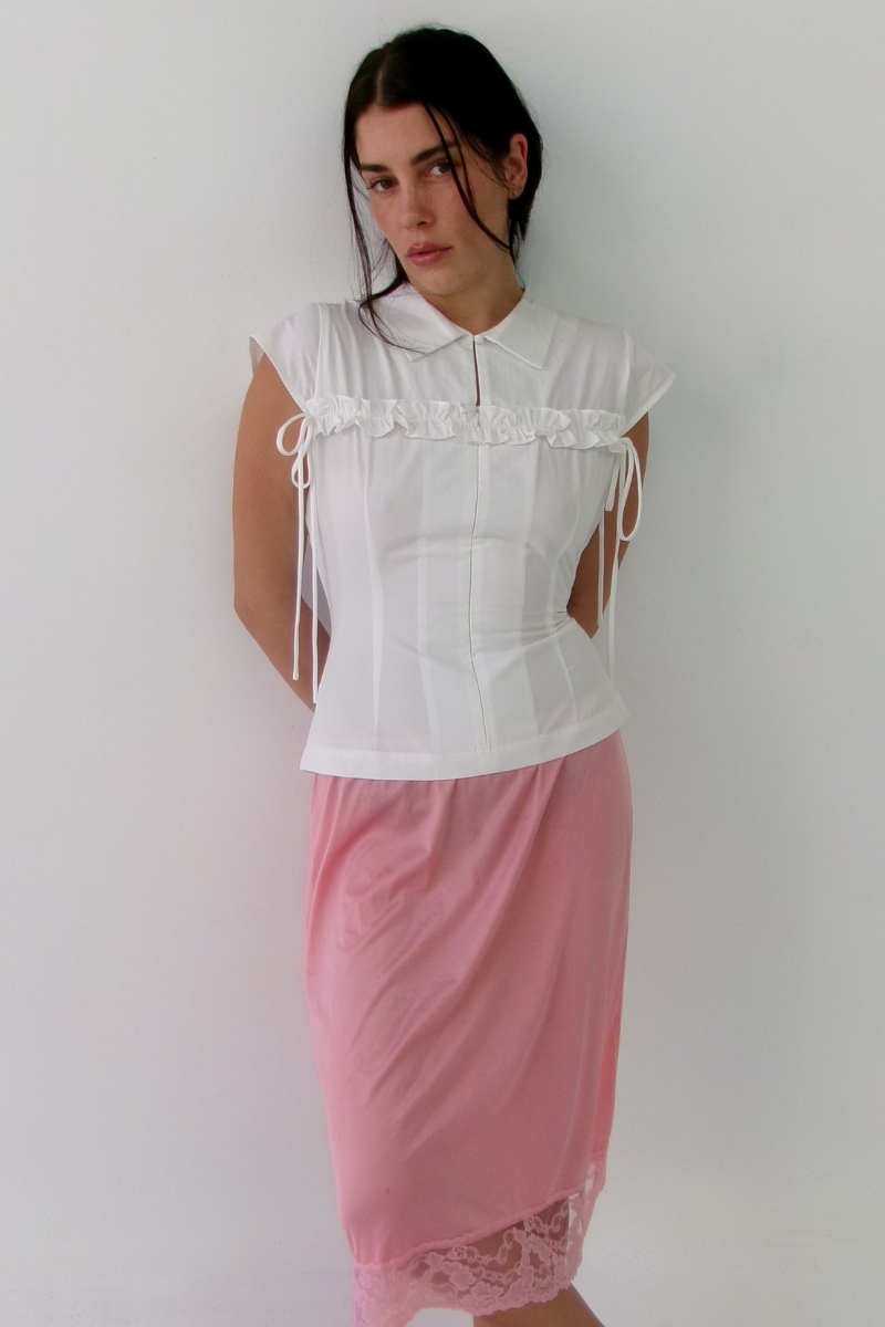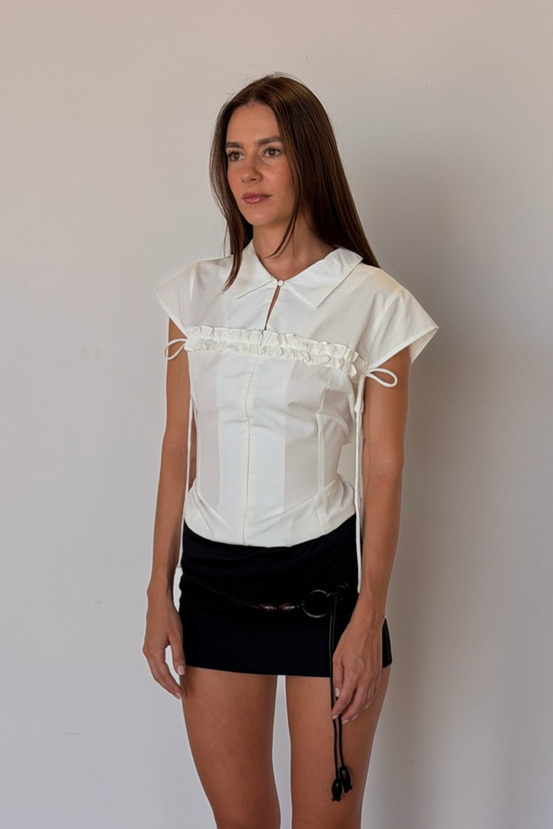 The Uma is a refined shirt with adjustable detail, featuring an invisible zip, back tie, and cap sleeve. Made from a soft cotton–modal blend with stretch for everyday wear.